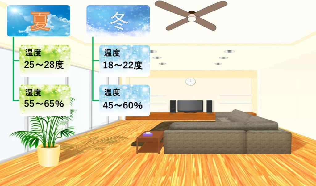 • 夏…温度25~28度で湿度55~65%