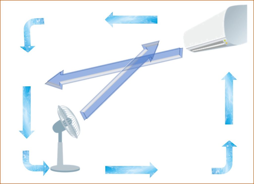 エアコンの風は一方通行になりますが、少し離した位置に扇風機を置きます。